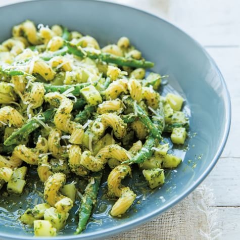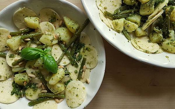 壓花圓麵片的裝飾性與功能性兼具,麵片上的浮雕突飾可以留住少許的油性醬汁。而與其最對味與最經典的醬汁莫過於由新鮮羅勒葉、大蒜、松子、橄欖油、帕馬森起士搗成的熱內亞青醬(pesto Genovese)了。Pesto是「被搗碎的」的意思。而其中最經典的又非熱內亞青醬,馬鈴薯與四季豆一起料理而成的壓花圓麵片。會有這樣的組合,是因為在以前的熱內亞共和國時代,當地的人們就已經會把大蒜和堅果搗成醬料來搭配義大利麵食用。會加馬鈴薯則是由於窮人買不起義大利麵,所以把這種醬料配馬鈴薯吃。不過由於馬鈴薯在十六世紀才由美洲來到歐洲,所以加入馬鈴薯食用是近幾個世紀的事了。而除了松子青醬外,壓花圓麵片也常搭配胡桃青醬。此外,只加了橄欖油、松子和墨角蘭的壓花圓麵片料理則是最簡便的一道。